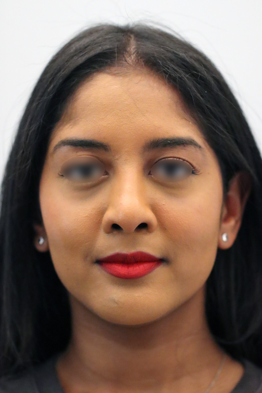 Vues post-opératoires face, ¾ droit, profil et face sourire après rhinoplastie