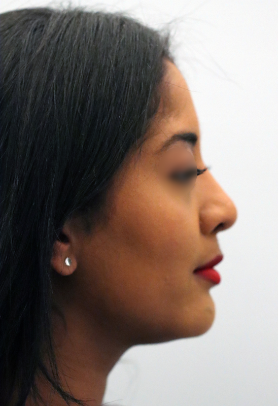 Rhinoplastie par voie interne avec ostéotomie pour suppression de bosse et affinement médian, associé à un affinement harmonieux de la pointe nasale, en évitant de creuser le nez et de relever l’angle naso-labial.